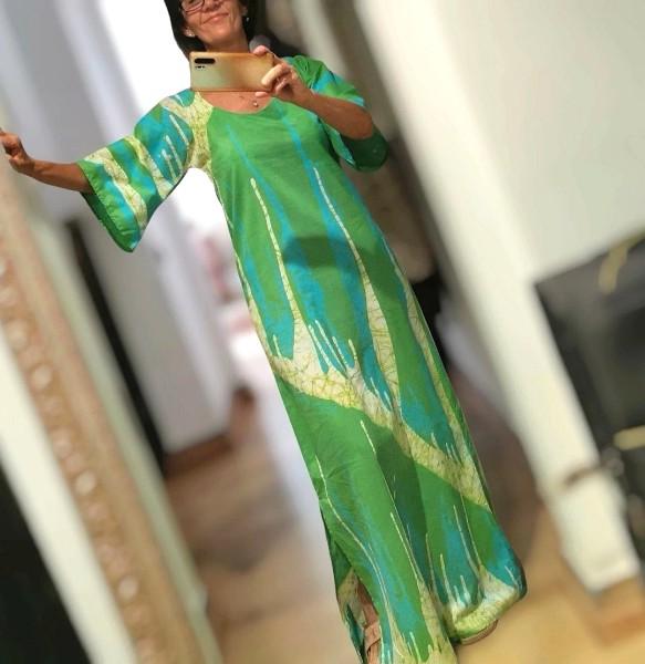 Je vends ma robe longue Bohême achetée dans une belle boutique des Bahamas. Tissu Batiké à la main Taille S qui corresponds à un 38 FR. A porter de préférence à partir d'1 m70 Couleurs fraîches et acidulées. 1 fente côté.